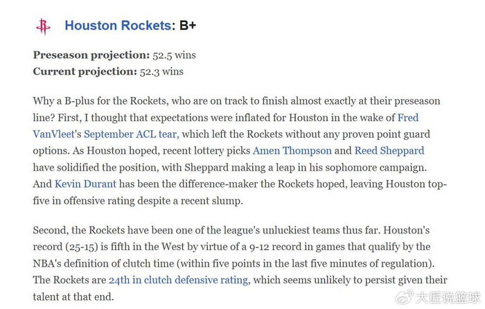 火箭队常规赛前41场比赛已经打完,权威美媒ESPN给出B+高评分。