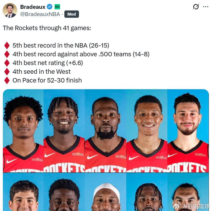 考虑到火箭队赛季至今一直遭遇严重伤病问题,核心控卫范乔丹迟迟未归,伊森、芬尼史密斯、亚当斯、申京等球员又在阵容中进进出出,火箭队这样的表现显然让人满意。
