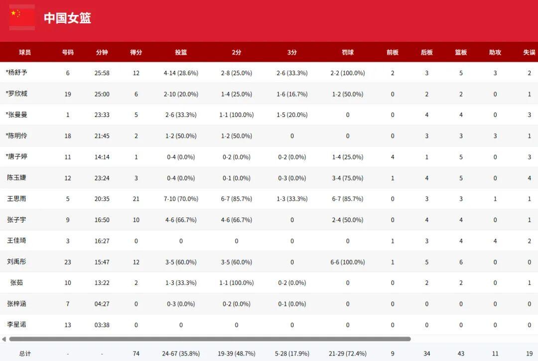 本赛季效力于武汉盛帆的王佳琦出场16分钟,虽然伤病初愈没有出手,但全队最高的4次助攻外加4个篮板,依然展现出这位联赛助攻王的价值。出自华中科技大学女篮、为湖北征战全运会的陈玉婕得到了23分钟的出场时间,有3分和5篮板入账。两位选手的主要精力都在防守和适应国家队节奏上,不算出彩,但贵在踏实。