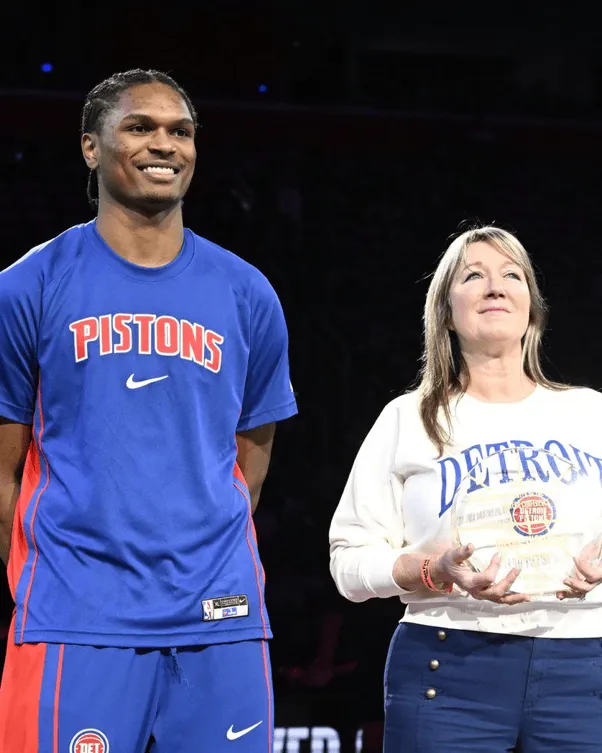 活塞官方更新了X,晒出赛前奥萨尔-汤普森的领奖照与球迷分享。
